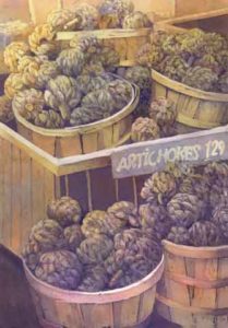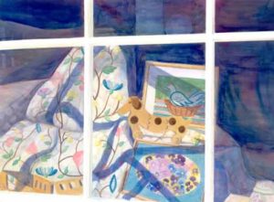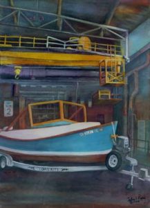 My interior paintings are often related to crafts, and depict workplaces or shops where craftsmen have learned skills to produce and sell handicrafts such as baskets, quilts, boats, and gourmet food.